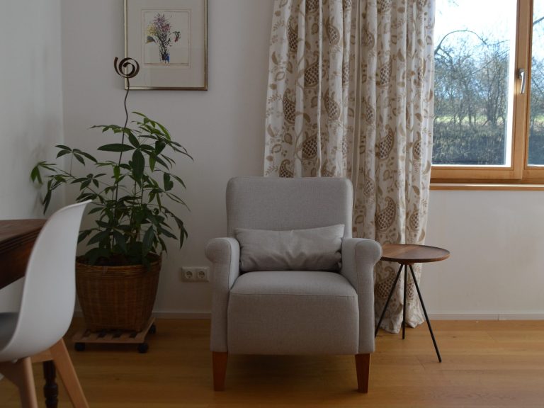 Das neu renovierte Appartement ist im 1. Stock eines alten Bauernhauses, mit einem ebenerdigen Zugang über die ehemalige Hochtennenauffahrt. Die großen Fenster im Schlafzimmer bieten einen reizvollen Blick in die unverbaute Landschaft und auf die bayerischen und Tiroler Alpen.
